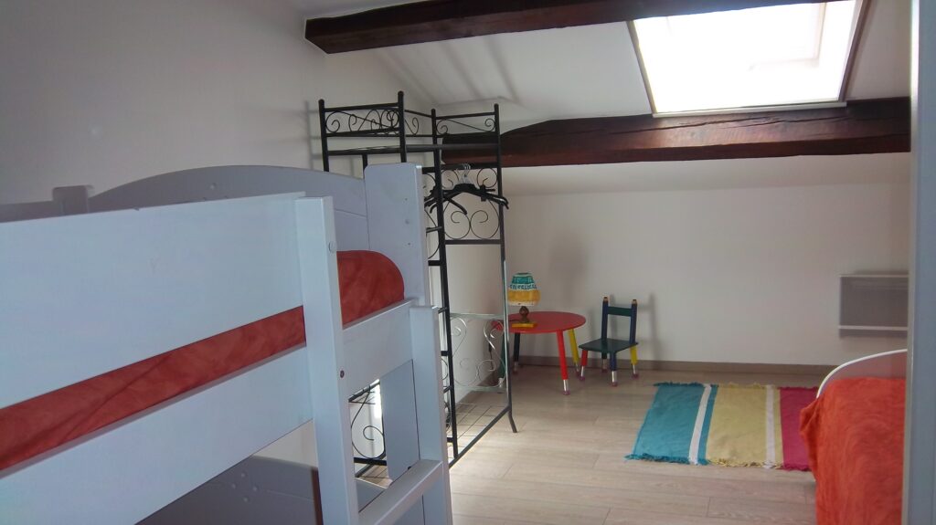 Il contient une chambre avec trois lits simples, une seconde dotée d’un lit double à l’étage et d’un canapé lit au premier niveau.