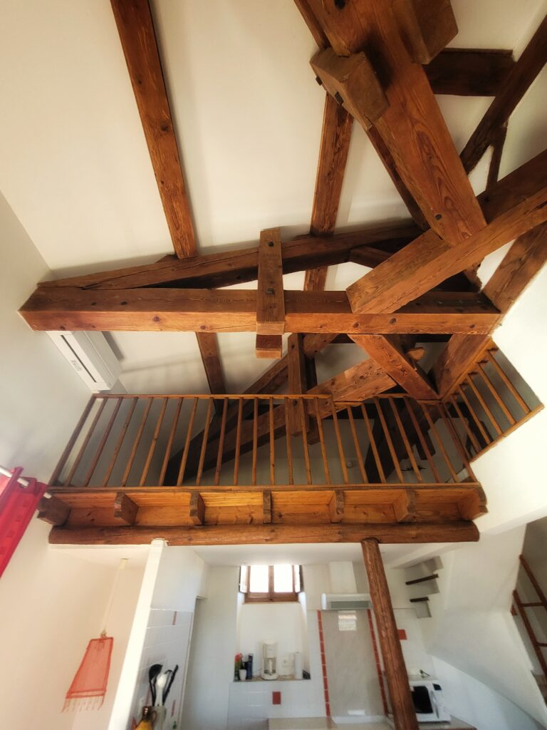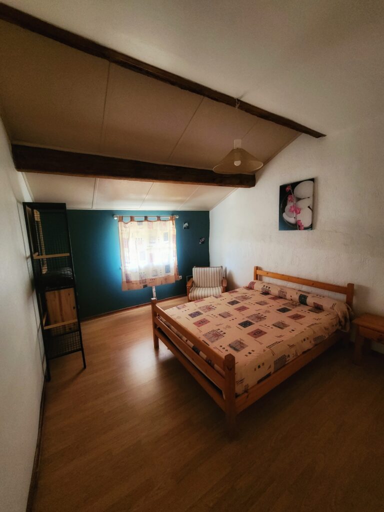 Ce grand gîte de type sur deux niveaux comporte deux chambres (un lit double, 3 lits simples) une grande pièce à vivre avec cuisine intégrée et une terrasse/solarium à l’étage ouverte sur les toits.