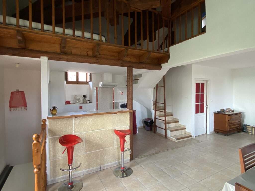 Le grand salon et la cuisine sont eux à l’étage inférieur et une mezzanine est aménagée sous la charpente apparente. L’appartement est climatisé et équipée d’un lave-linge, lave vaisselle, four, micro-ondes ainsi que d’un canapé lit.